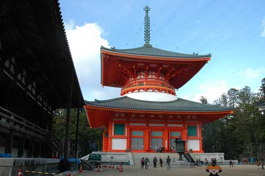 奥の院と並ぶ弘法大師ゆかりの聖地である壇上伽藍と、秀吉が建立した現在の金剛峯寺は高野山市街地からも程近い。奈良時代から平安初期を思わせる広大な敷地と相応の大規模建築群は、確かに高野山のシンボルにふさわしい。特に壇上伽藍の根本大塔は、その大きさにまず圧倒される。弘法大師により、日本で最古の多宝塔形式の建造物だとされるが、現在のものは1937年に再建されたRC造の建造物だが、既に開創1200年に向けての補修工事は完了している。