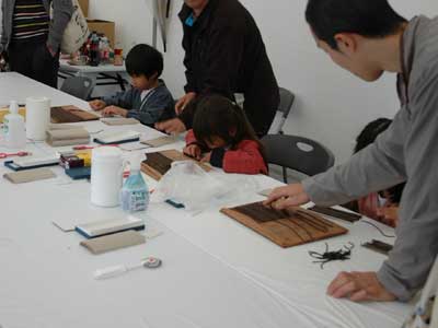 土曜日8日は、天候にも恵まれた一日となり、同時開催のメイドインさかいフェアにも大変大勢のご来客がありましたが、翌日の日曜日は残念ながら一変して肌寒い雨模様な一日。それでも前日を上回る子供達が、当ブースの線香づくり体験に訪れ、子供達の熱気が溢れる一日となりました。